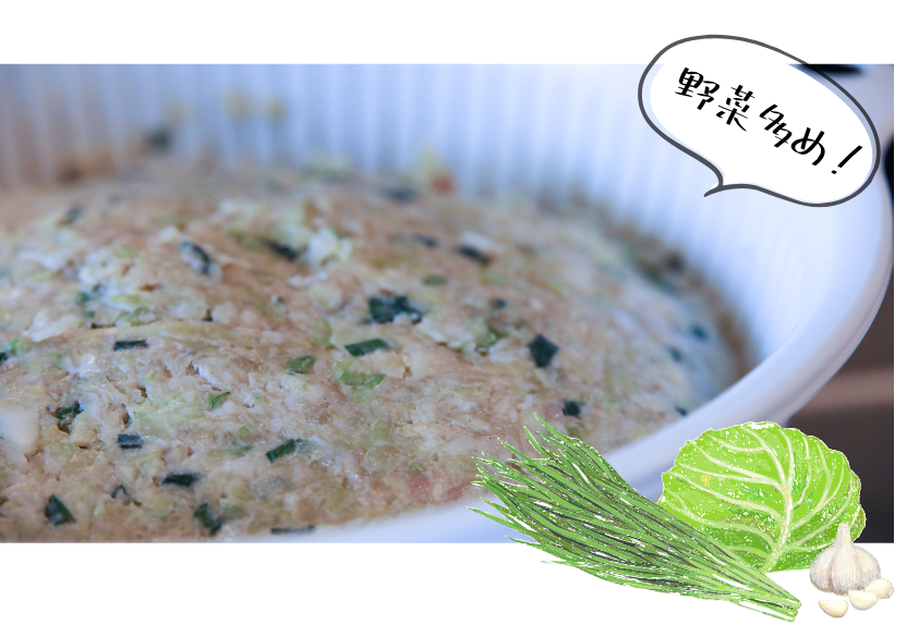 餃子に合う厳選した国産豚を使用し、野菜が多め。多くの餃子が9:1くらいで肉の割合が多いのですが、当店の餃子はかなり野菜の割合が多いため、“軽く”食べられてお子様や女性にも好評いただいています。